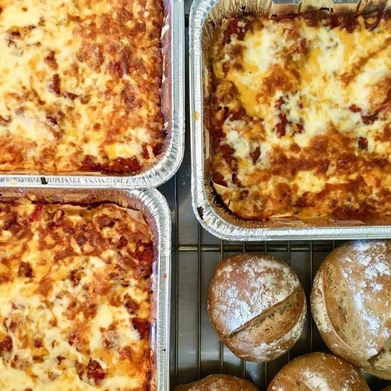 Mike’s AMAZING homemade pasta lasagna with local grass fed beef and sausage.